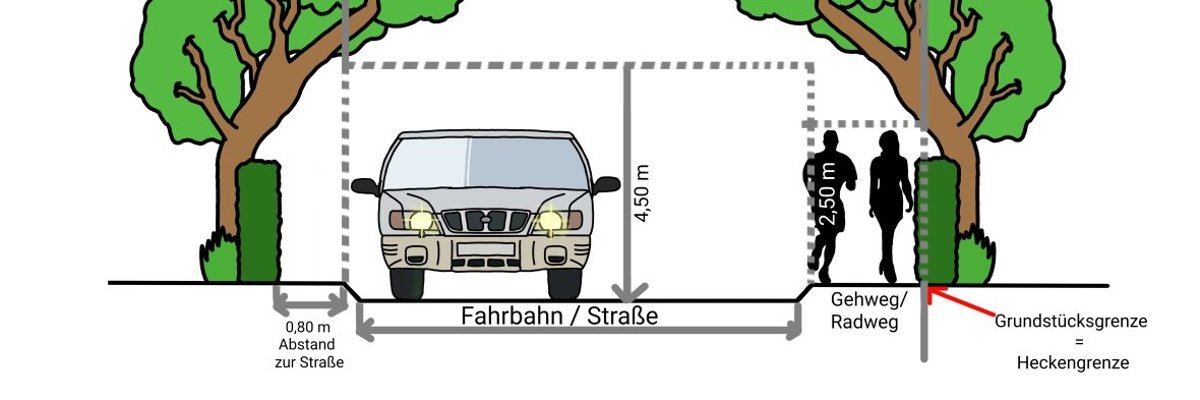 Die Verkehrssicherheit auf unseren öffentlichen Straßen, Wegen und Plätzen ist für alle Verkehrsteilnehmer wichtig. Äste und Sträucher, die aus dem Garten in die Straße und in den Gehweg hineinragen, können ein ernsthaftes Sicherheitsrisiko für die Verkehrsteilnehmer darstellen. Oft sind Gehwege durch wuchernde Hecken und Sträucher so weit eingeengt, dass bereits für Fußgänger kein Durchkommen mehr möglich ist. Vor allem für Menschen im Rollstuhl, mit Kinderwagen, Rollator oder Kinder auf dem Fahrrad, ist das Ausweichen auf die Straße gefährlich. Zudem wird nicht nur die Sicht an Kreuzungen und Einmündungen eingeschränkt, oft werden Verkehrszeichen, Beleuchtungen oder Hausnummern verdeckt.