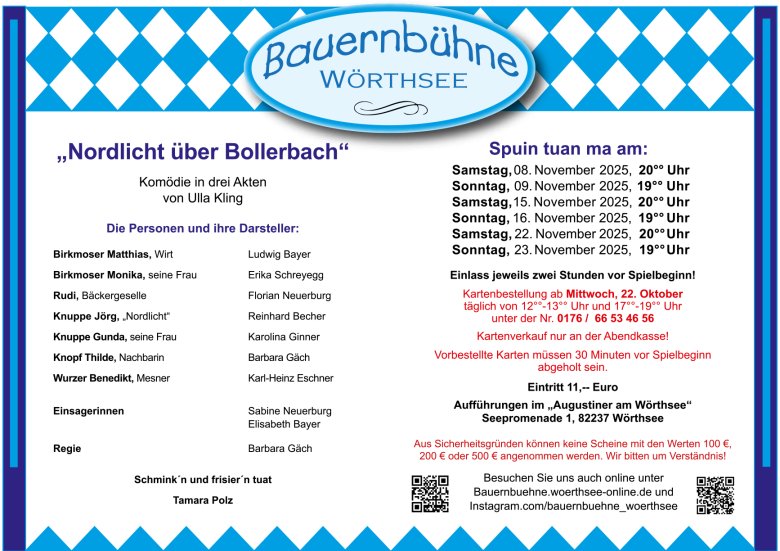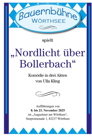 Aufführungen an den Wochenenden 08./09.11., 15./16.11. und 22./23.11. beim Augustiner am Wörthsee, Seepromenade 1. Beginn samstags 20°° Uhr, sonntags 19°° Uhr; Einlass jeweils zwei Stunden früher. Kartenbestellung ab Mittwoch, 23. Oktober 2024 täglich von 12°° bis 13°° und 17°° bis 19 ° Uhr unter der Nr. 0176/66 53 46 56 - Kartenverkauf nur an der Abendkasse! Vorbestellte Karten müssen 30 Minuten vor Spielbeginn abgeholt sein.