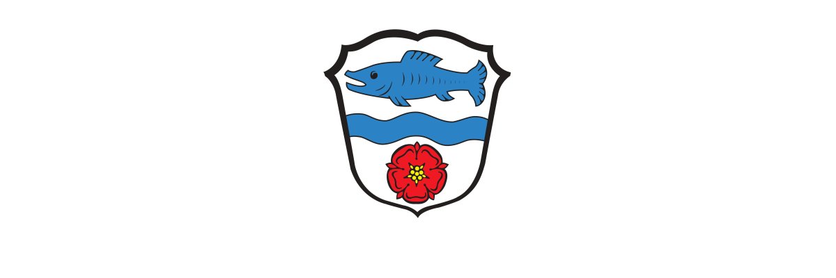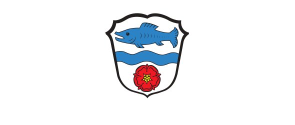 Wappenbeschreibung: In Silber, ein blauer Wellenbalken, darüber ein blauer Fisch, darunter eine rote heraldische Rose (Heraldik = Wappenkunde).